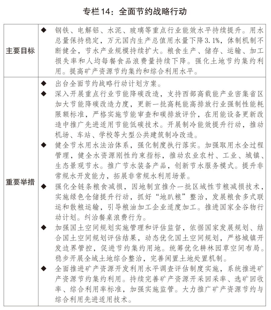 三是加快形成绿色生产生活方式。开展全面节约战略行动,持续推动“能水粮地矿材”一体化节约。推动修订节约能源法,修订重点用能和碳排放单位管理办法,开展制冷能效提升和绿色照明行动,推行公共机构能源费用托管等市场化节能模式。深化节水型社会建设,扩大非常规水利用规模,大力发展节水产业。大力开展粮食节约和反食品浪费行动。发展循环经济,提高垃圾分类和资源化利用水平,加快构建废弃物循环利用体系,加强再生材料推广使用。支持氧化铝提锂提镓。支持“以竹代塑”产业发展。设立国家低碳转型基金,培育氢能、绿色燃料等新增长点。健全绿色消费激励机制,推广绿色低碳生活方式。