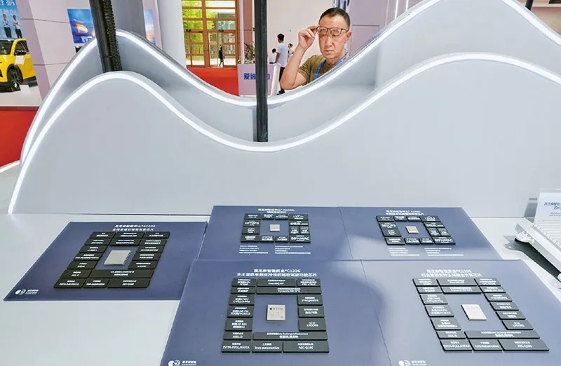 2025年7月16日至20日,第三届中国国际供应链促进博览会在北京举行,30余家中外企业和机构在智能汽车链展区集中展示产业链上中下游的关键技术和产品。图为7月19日,参观者在观看展出的辅助驾驶芯片产品。 新华社记者 鞠焕宗/摄