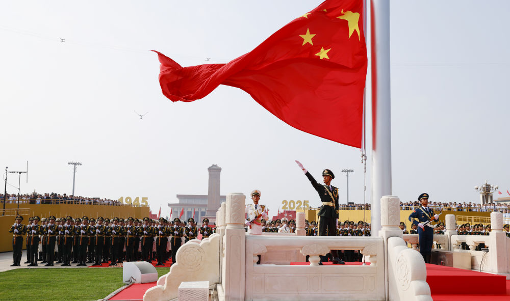 2025年9月3日,纪念中国人民抗日战争暨世界反法西斯战争胜利80周年大会在北京隆重举行。这是天安门广场举行隆重的升国旗仪式。新华社记者 费茂华 摄