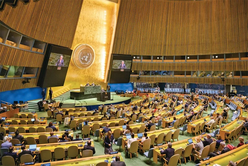 当地时间2025年6月26日,联合国秘书长古特雷斯在联合国大会纪念联合国宪章签署80周年的非正式全体会议上发表讲话,敦促所有会员国遵守宪章精神、担负起宪章规定的责任、追求宪章所描绘的未来。图为会议现场。 新华社发 联合国供图 洛伊·费利佩/摄