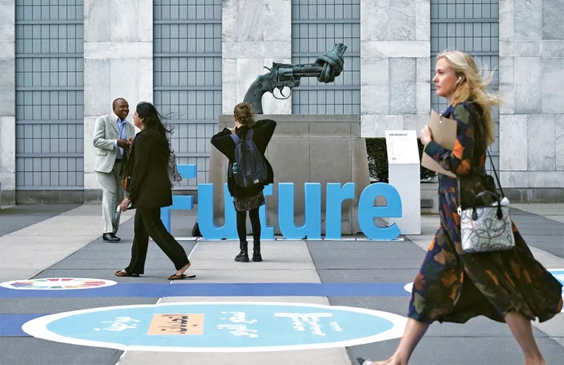 当地时间2024年9月23日,联合国未来峰会在美国纽约闭幕。会议通过了描绘世界未来发展蓝图的《未来契约》,旨在改革国际治理体系,振兴多边主义,以更好应对新时代所面临的诸多挑战。图为当日,在位于纽约的联合国总部,与会者从联合国未来峰会会场外走过。 新华社记者 吴晓凌/摄
