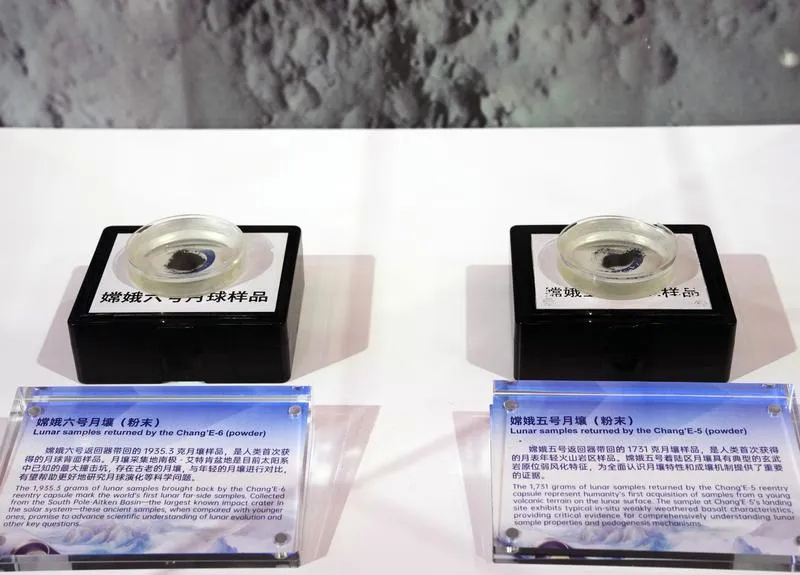2025年11月5日至10日,第八届中国国际进口博览会在上海举办。本届进博会上,中国馆展示中国“十四五”期间全面深化改革、推进高水平开放的最新成就,众多科技成果引人瞩目。图为11月5日在第八届进博会国家展中国馆拍摄的嫦娥五号月壤和嫦娥六号月壤。 新华社记者 刘颖/摄