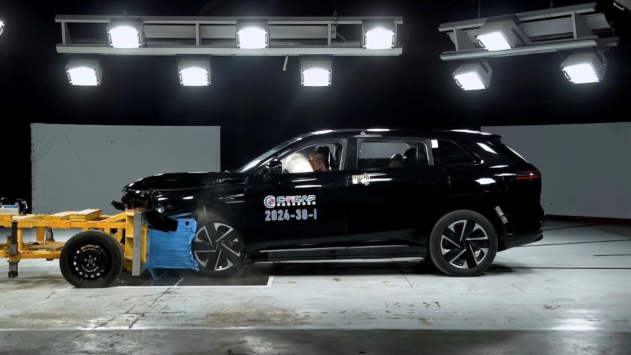 在上百米的专用跑道上,一辆标准台车疾驰而来,直接撞上正前方的轿车,“砰”的一声轰响,轿车两个侧门瞬间凹陷,安全气囊应声迸发,如白色护盾骤然撑开。