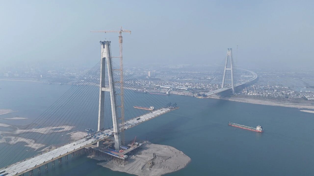 图为2026年2月2日,湖北省枝江市,正在建设过程中的枝江长江大桥。枝江市融媒体中心供图 朱深耕/摄