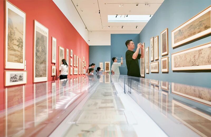 “中国历代绘画大系”,是习近平总书记亲自批准、高度重视、持续关注,并多次作出重要批示的一项规模浩大、纵贯历史、横跨中外的国家级重大文化工程。截至2025年7月,“中国历代绘画大系”共收录海内外263家文博机构的纸、绢(含帛、绫)、麻等材质的中国古代绘画藏品12405件(套)。图为2025年7月8日,游客在位于浙江省杭州市余杭区的中国历代绘画大系典藏馆参观。 浙江省委宣传部供图