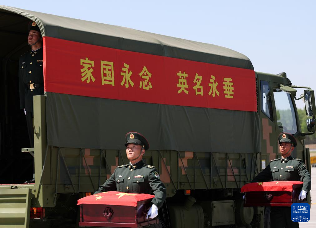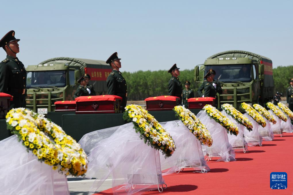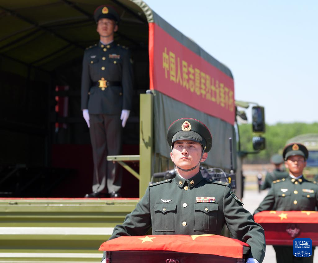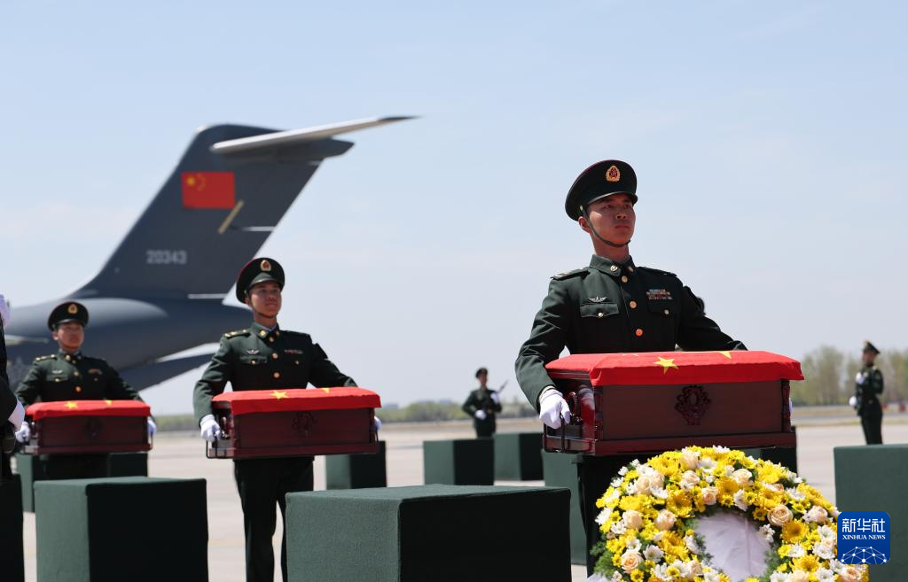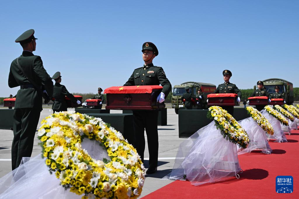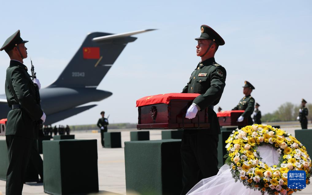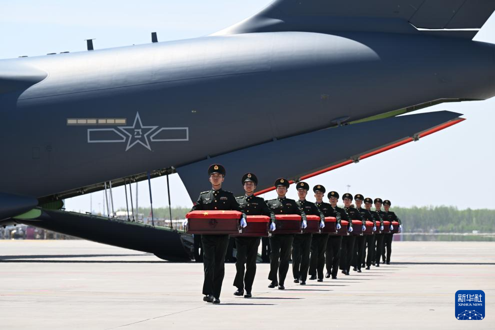 4月22日,第十三批在韩中国人民志愿军烈士遗骸由中国空军运-20B从韩国接回辽宁沈阳。这是迎回仪式上,礼兵将覆盖着五星红旗的志愿军烈士遗骸棺椁整齐安放。4月22日上午,第十三批在韩中国人民志愿军烈士遗骸由中国空军运-20B从韩国接回辽宁沈阳。12位志愿军烈士英灵及146件遗物回到祖国怀抱。新华社发(余红春 摄)