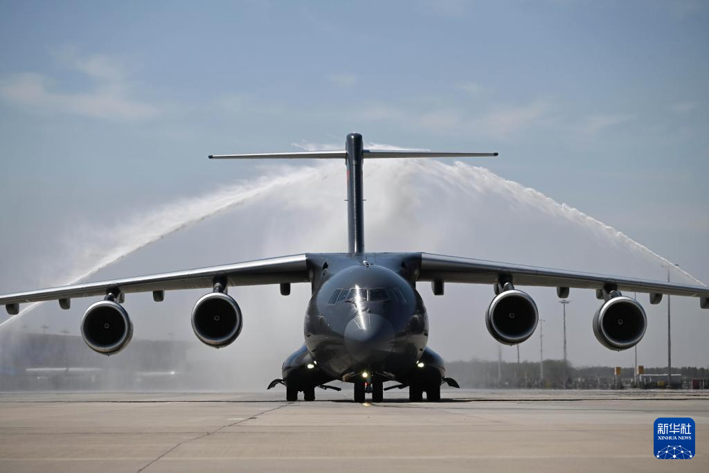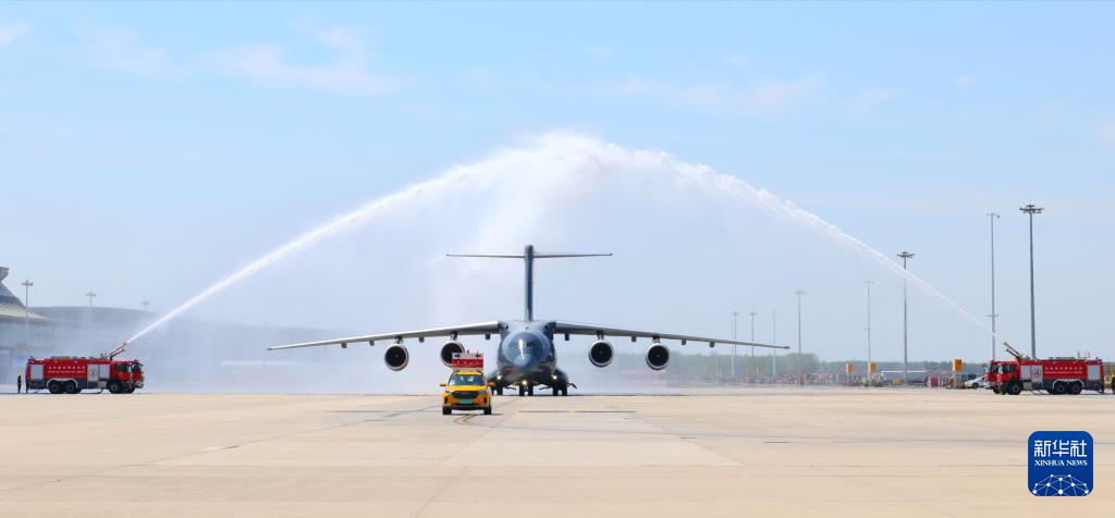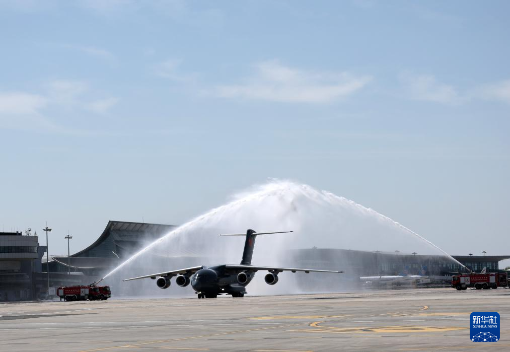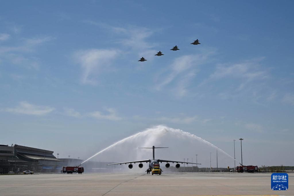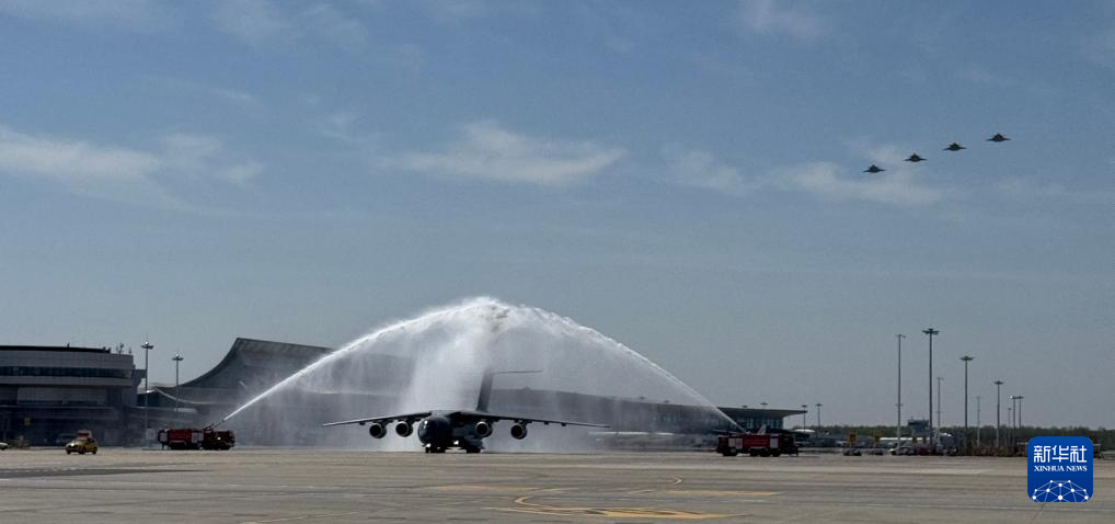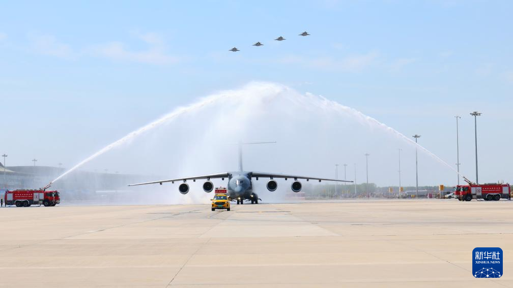 4月22日,接迎志愿军烈士遗骸回国的空军运-20B平稳降落沈阳桃仙国际机场,机场以航空最高礼仪“过水门”仪式为志愿军烈士英灵洗尘。4月22日上午,第十三批在韩中国人民志愿军烈士遗骸由中国空军运-20B从韩国接回辽宁沈阳。12位志愿军烈士英灵及146件遗物回到祖国怀抱。新华社记者 杨青 摄