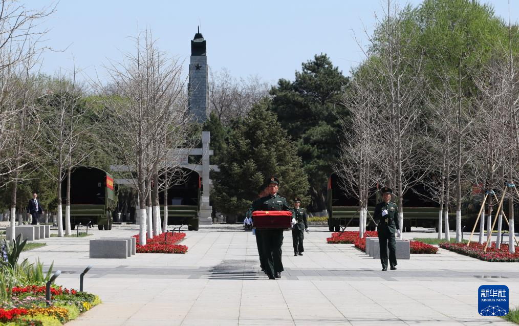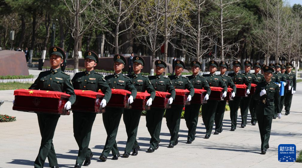 4月22日,礼兵护送志愿军烈士遗骸棺椁抵达沈阳抗美援朝烈士陵园。4月22日上午,第十三批在韩中国人民志愿军烈士遗骸由中国空军运-20B从韩国接回辽宁沈阳。12位志愿军烈士英灵及146件遗物回到祖国怀抱。新华社记者 杨青 摄